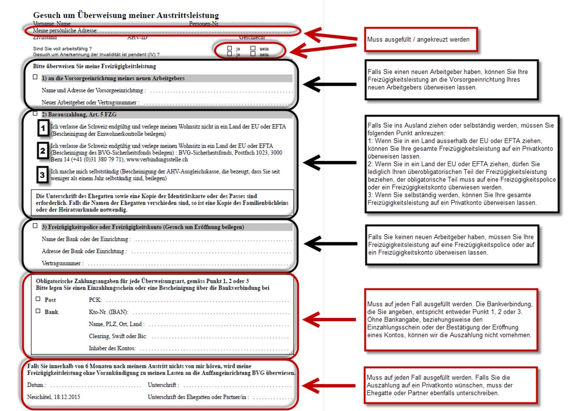 In der untenstehenden Grafik erklären wir Ihnen Schritt für Schritt, wie Sie Ihr Gesuch um Überweisung der Austrittsleistung ausfüllen sollten.
